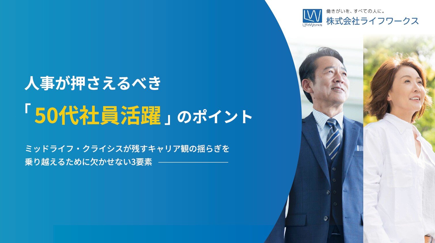 ライフワークスTOP C・Dラボ お役立ち資料 人事が抑えるべき「50代社員活躍」のポイントとは? お役立ち資料 人事が抑えるべき「50代社員活躍」のポイントとは? 労働力不足が深刻化する中、もっとも豊富な経験を持つ50代社員の活躍は、企業の競争力を維持するための鍵となります。しかし、従来のマネジメント手法だけでは、彼らの内面にある複雑な葛藤を解消することはできません。 本ホワイトペーパーでは、ライフワークスが培ってきた知見をもとに、50代社員の意識変革を促すポイントを凝縮しました。キャリアの停滞感を打破し、自律的な貢献意欲を引き出すための「3要素」を紐解き、ベテラン層が「真の戦力」として躍動する組織づくりのヒントをお届けします。 導入企業一覧 シェア ツイート お役立ち資料の一覧へ戻る